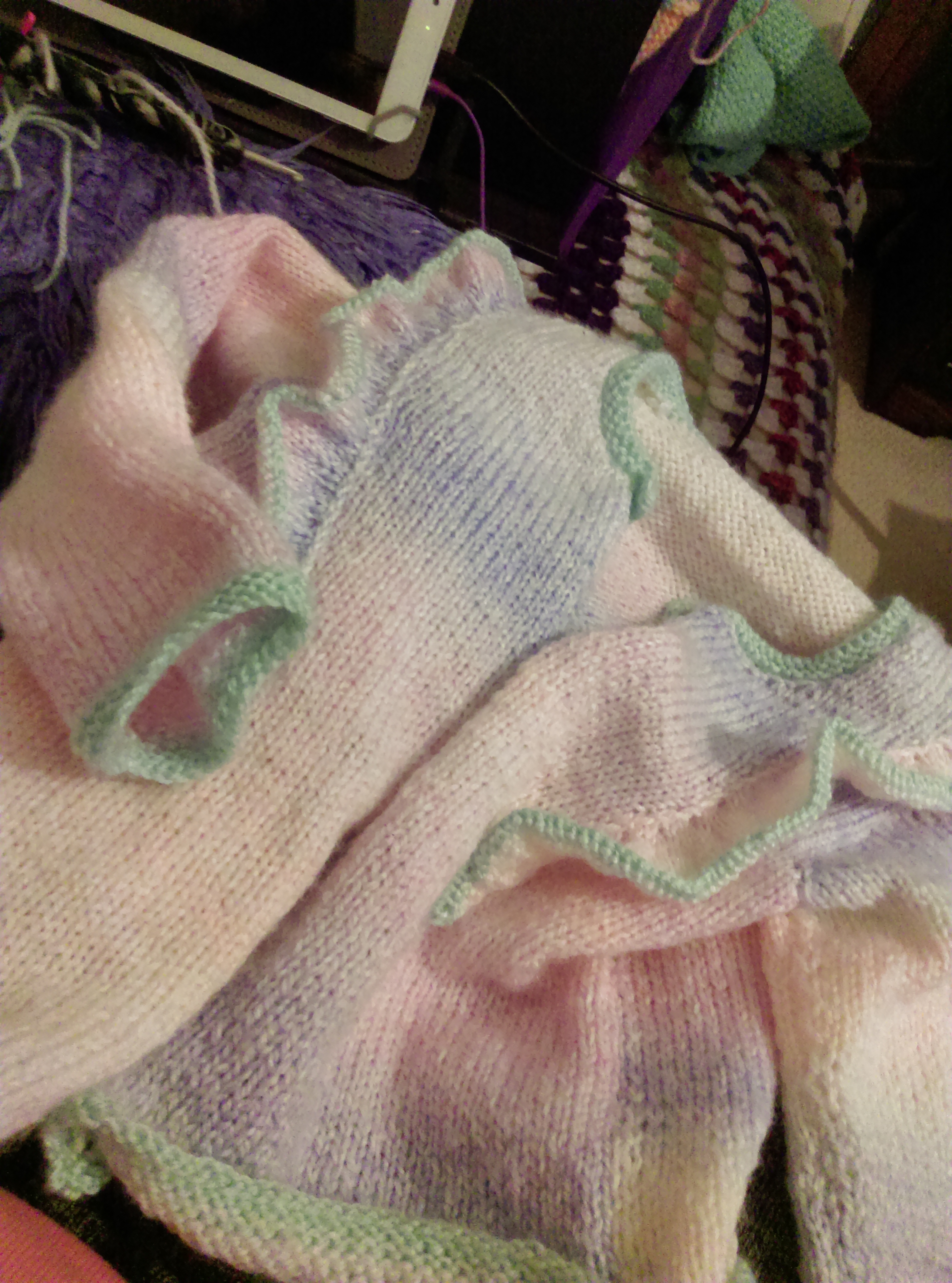 This is the edge in progress for the tiny baby cardigan (it was a picked up edge) which in the end looks really cute! But I found that like with knitting the frills it required lots of concentration when it came to button holes (the first time I have ever knitted a button hole).